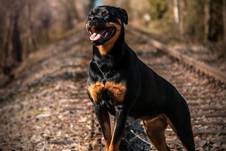 Un Rottweiler en position statique sur une voie ferrée