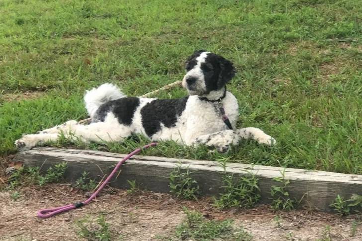 Un Saint Berdoodle allongé sur un terrain herbeux et qui est tenu en laisse