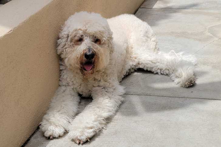 Un Saint Berdoodle allongé sur une surface bétonnée et tirant la langue