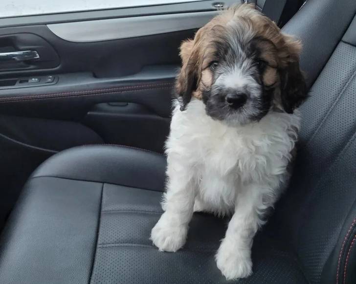 Un Saint Berdoodle assis sur le siège d'une voiture et regardant vers la caméra