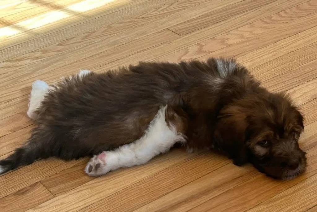 Un Saint Berdoodle allongé sur un plancher et semblant détendu