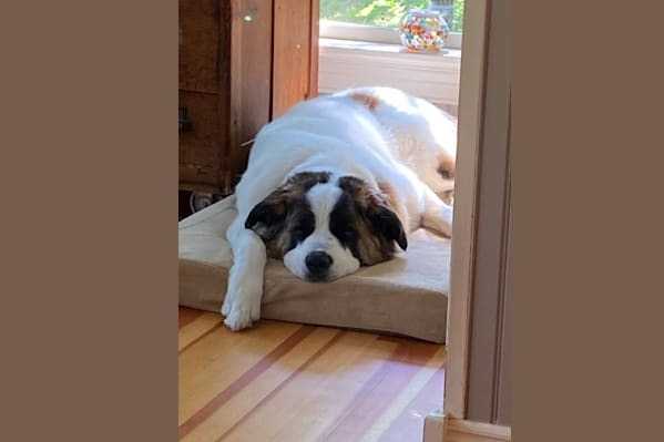 Un Saint Bermastif au pelage tricolore, allongé sur un matelas et semblant se reposer