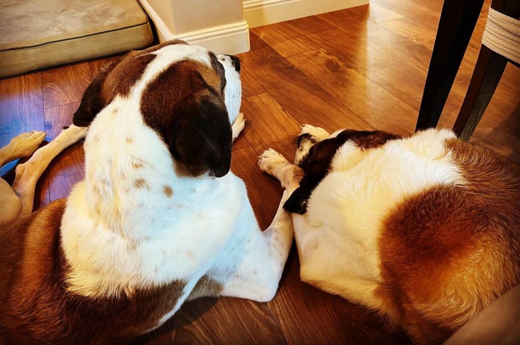 Deux Saint Dane allongé de dos sur un sol en bois et qui semblent détendus