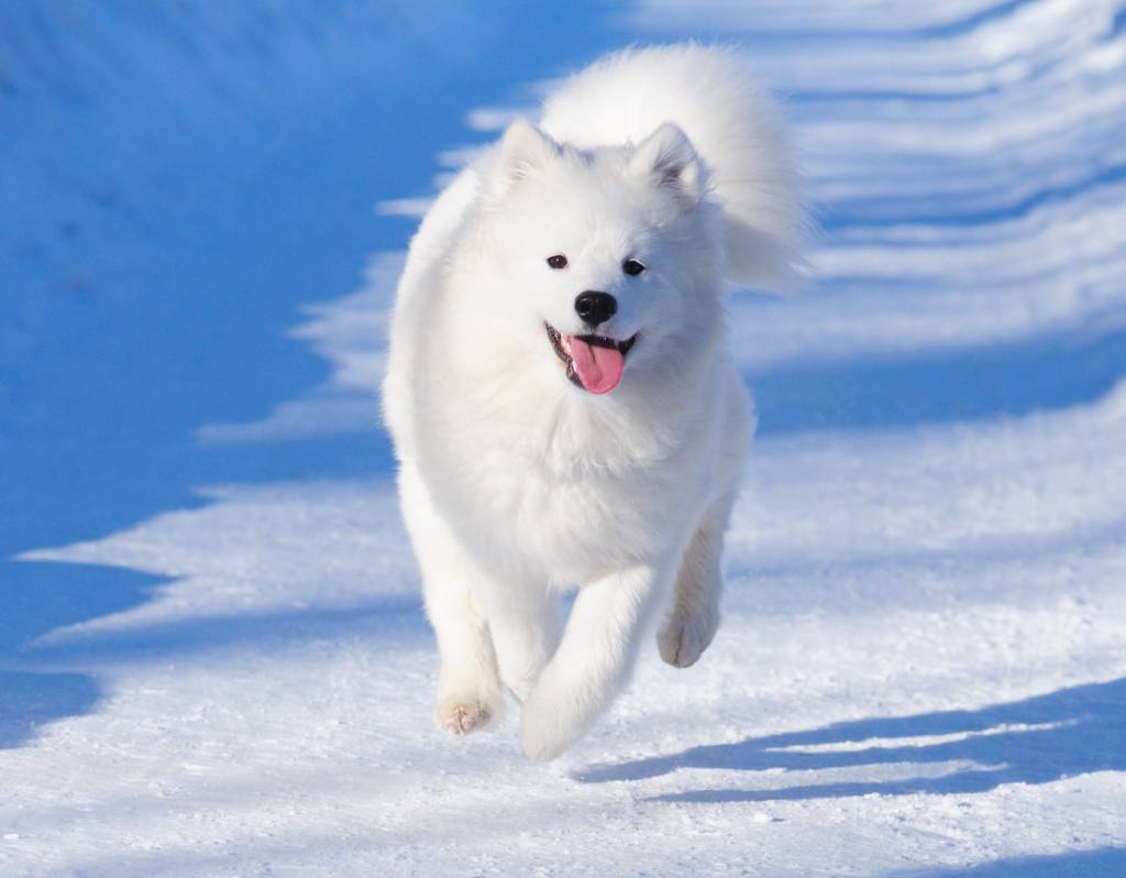 Un Samoyède heureux court dans la neige