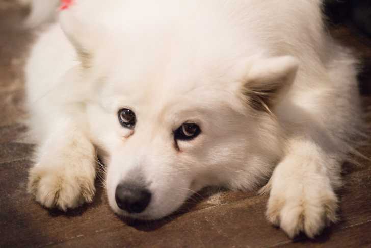 Un Samoyède allongé la tête entre les pattes