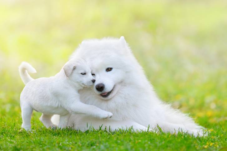 Une maman Samoyède et son chiot dans un jardin