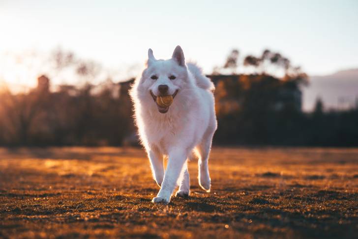 Un Samoyède se promène avec une balle dans la gueule au coucher du soleil