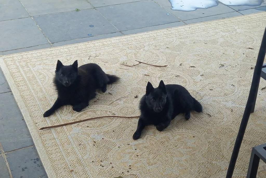 Deux Schipper Chi allongé sur un tapis et regardant tous deux la caméra