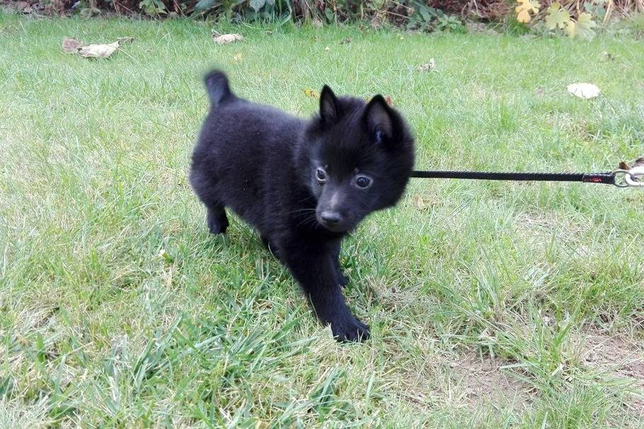 Un Schipper Chi sur un terrain herbeux et qui est tenu en laisse
