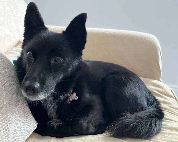 Un Schipper Chi allongé sur un canapé et portant un collier autour du cou
