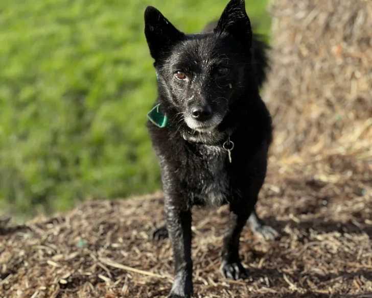 Un Schipper Chi marchant sur une surface herbacée et portant un collier autour du cou