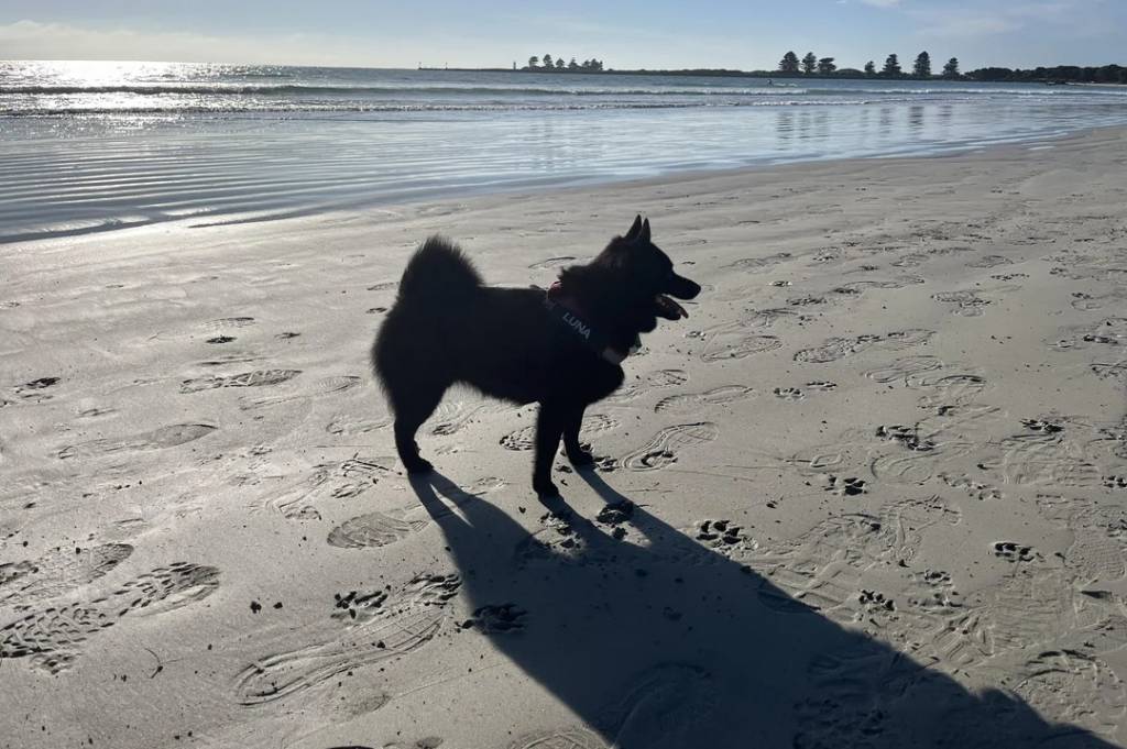Un Schipper Chi sur une surface sableuse et portant un collier autour du cou