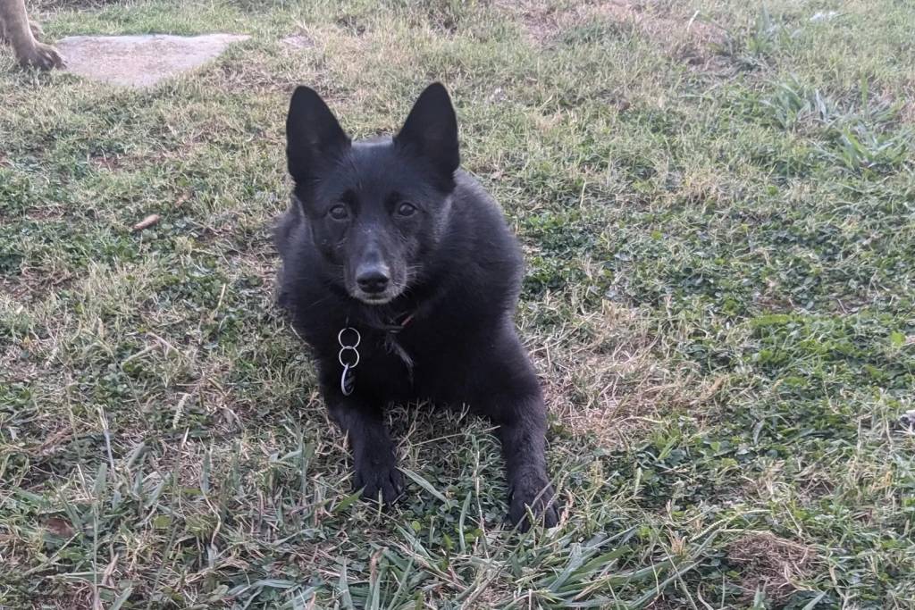 Un Schipper Chi allongé sur un terrain herbeux et portant un collier autour du cou