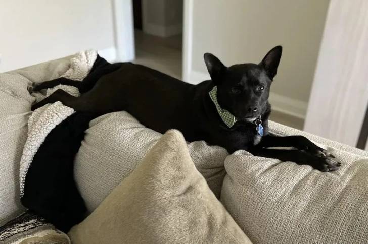 Un Schipper Chi allongé sur un canapé et portant un collier autour du cou
