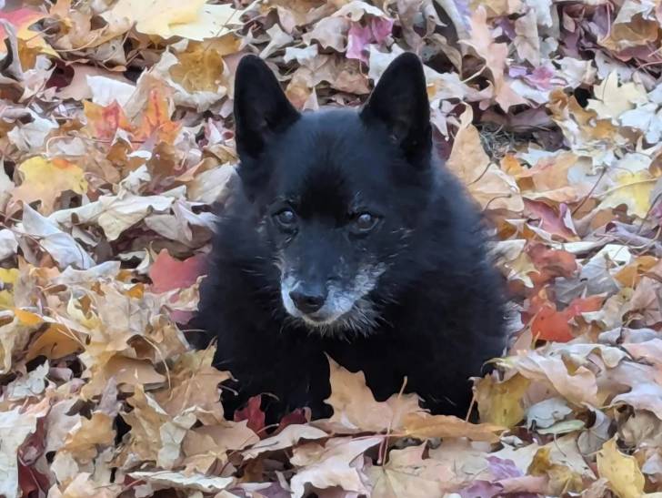 Un Schipper Chi allongé sur un sol jonchés de feuilles mortes et semblant détendu