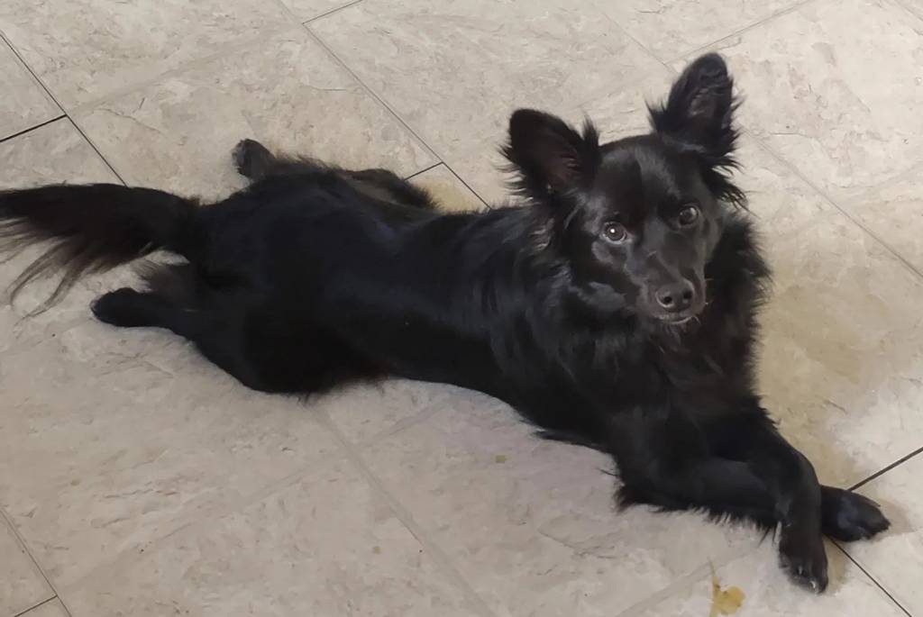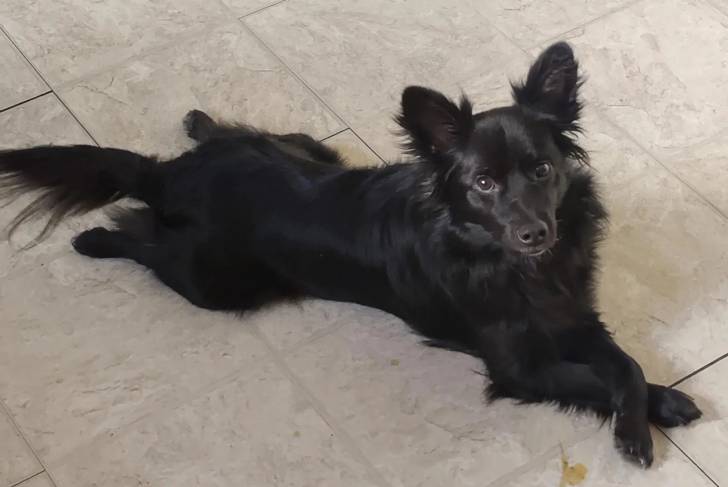 Un Schipper Chi allongé sur un sol carrelé et regardant vers la caméra