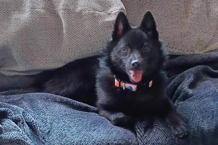 Un Schipper Chi tirant la langue et portant un collier autour du cou