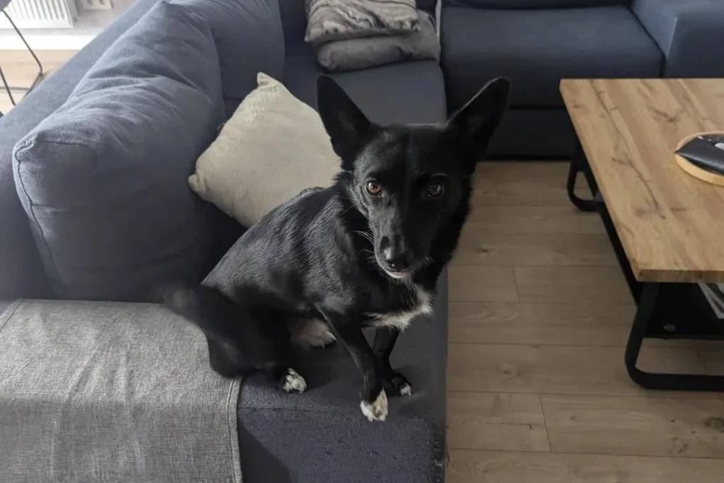 Un Schipper Chi assis sur un canapé et regardant vers la caméra