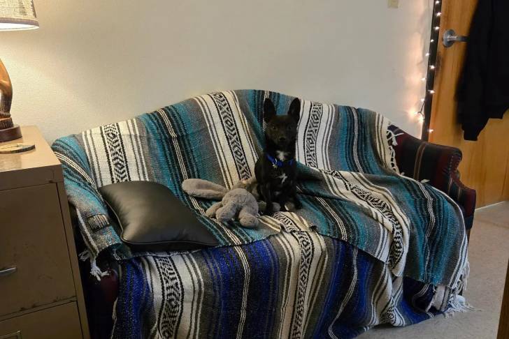 Un Schipper Chi assis sur un canapé et portant un collier autour du cou