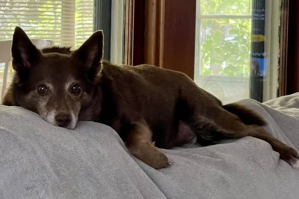 Un Schipperke allongé sur un canapé et regardant vers la caméra