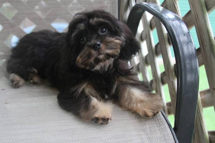 Un Schmoodle allongé sur un canapé moelleux et semblant détendu