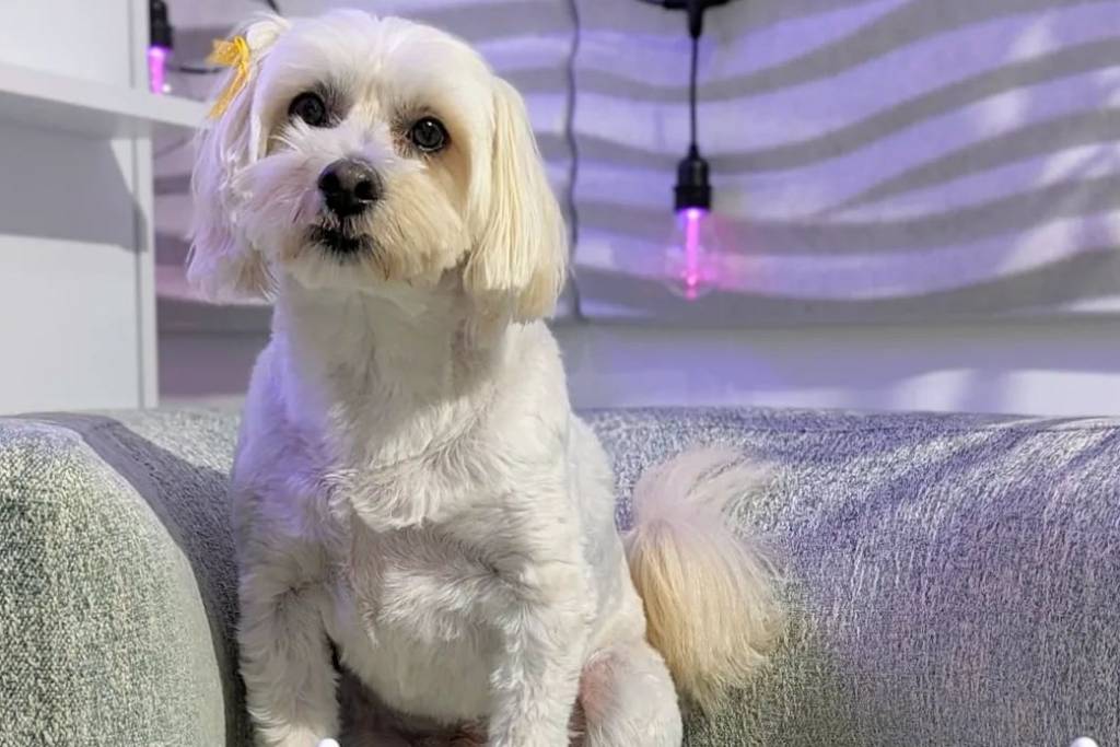 Une femelle Schmoodle assise sur un canapé tout en fixant la caméra