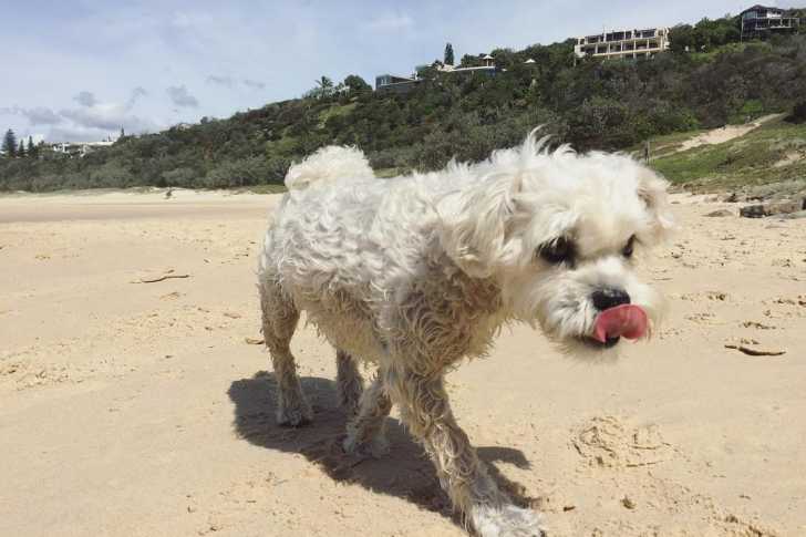 Un Schnau-Tzu blanc marchant dans du sable fin tout en léchant son museau et semblant détendu
