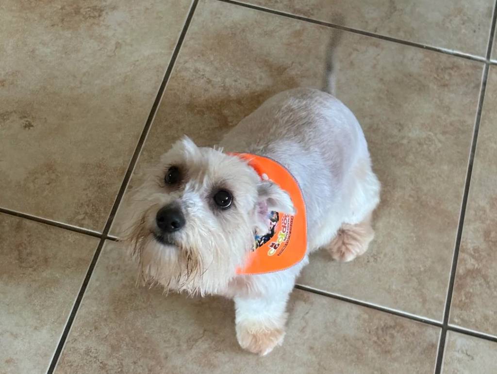 Un Schnauzer Nain sur un sol carrelé et portant un foulard autour du cou