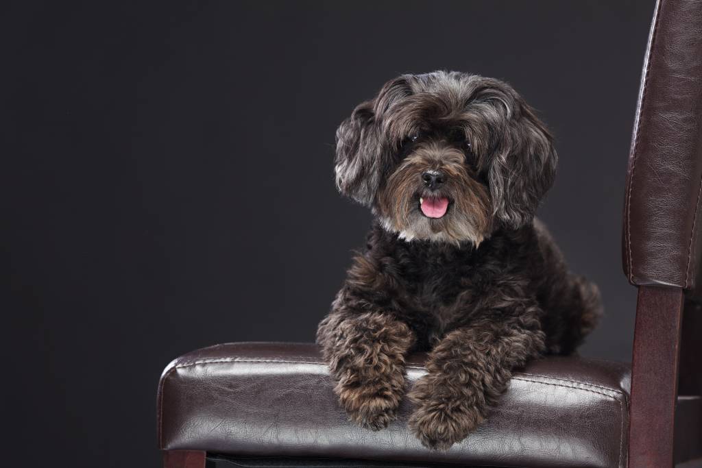 Un Schnoodle au pelage brun ondulé, se tenant assis sur une chaise en cuir