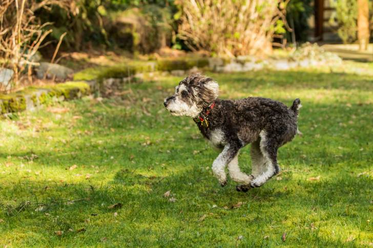 Un Schnoodle au pelage gris et blanc, courant dans un jardin
