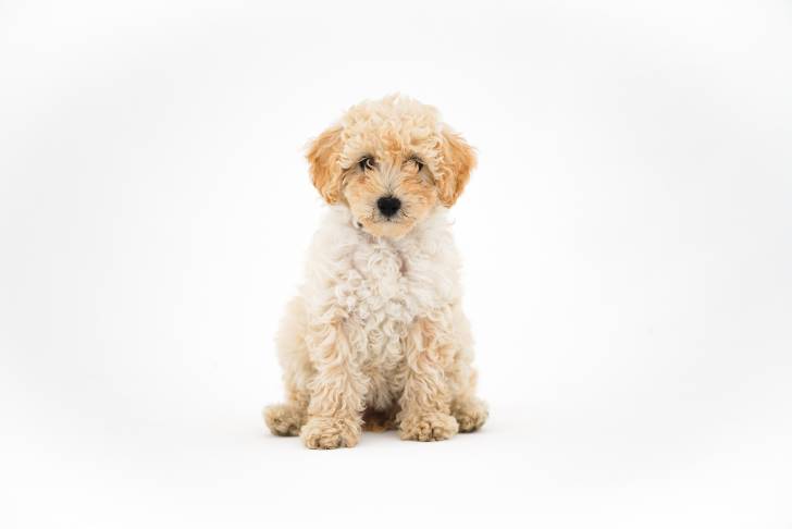 Un Schnoodle au pelage abricot se tenant assis sur un fond blanc