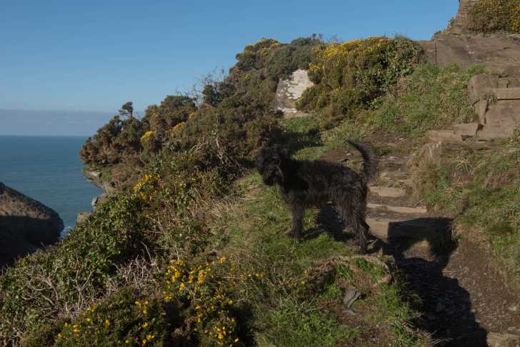 Un Schnoodle au pelage brun se tenant debout sur une falaise