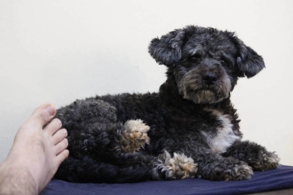 Un Schnoodle au pelage gris et blanc se tenant allongé sur un matelas bleu