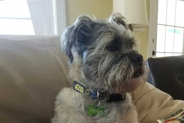 Un Schnug portant un collier et assis sur un canapé