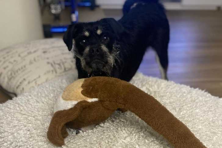 Un Schnug noir debout sur un tapis blanc