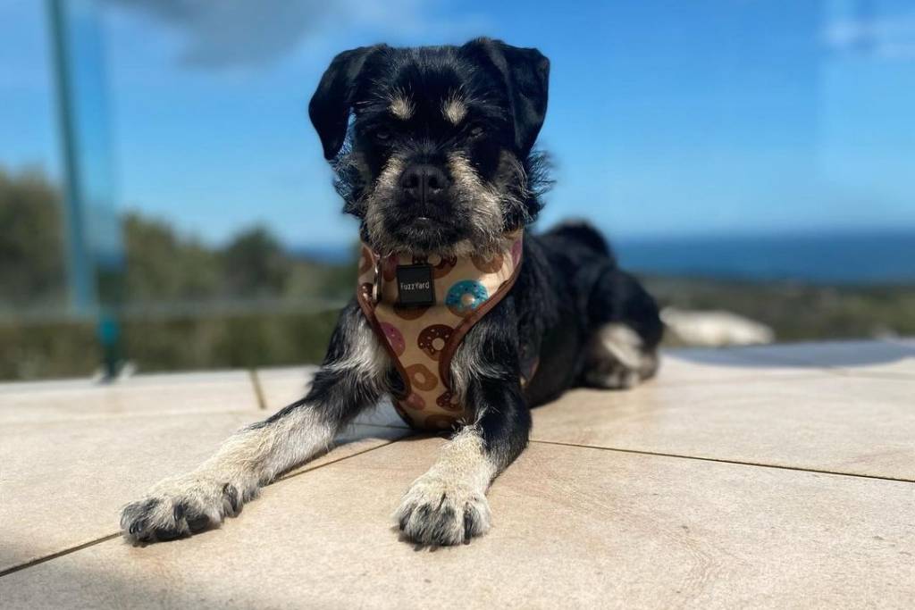 Un Schnug portant un harnais et allongé sur un sol carrelé avec ses pattes avant étirées devant lui