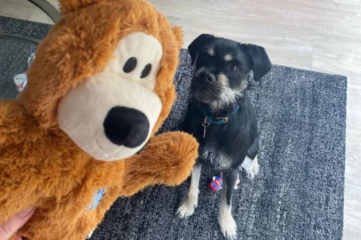 Un Schnug assis sur un tapis en regardant un jouet en peluche qui lui est tendu