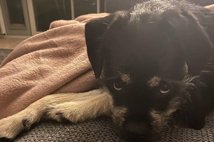 Un Schnug reposant sa tête sur l’accoudoir d'un canapé