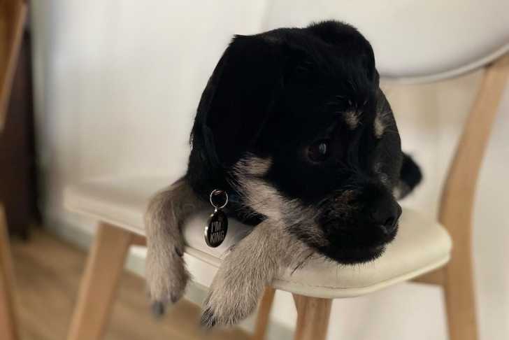 Un Schnug reposant sa tête sur une chaise blanche