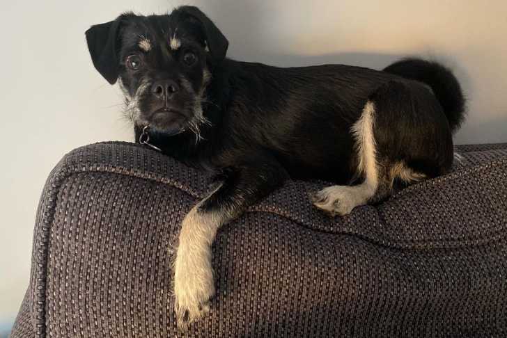 Un Schnug allongé sur l’accoudoir d'un canapé