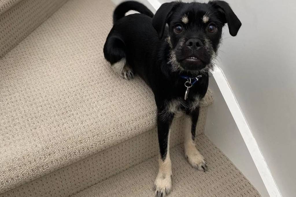 Un Schnug assis sur un escalier recouvert de moquette beige