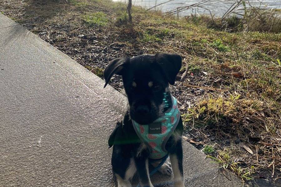 Un Schnug portant un harnais vert assis sur un chemin à côté d’un lac