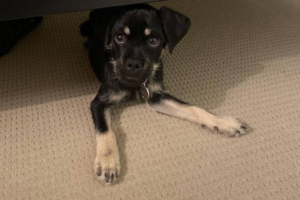 Un Schnug allongé sur une moquette sous un lit