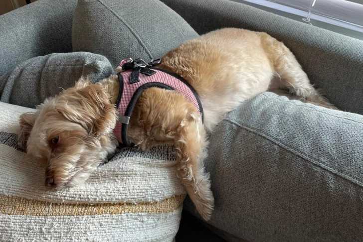 Un Schweenie de couleur claire allongé sur un canapé gris
