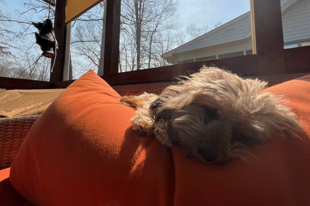 Un Schweenie de pelage marron allongé sur des coussins de couleurs oranges et qui semble se reposer.