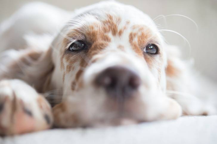 Un jeune Setter Anglais allongé par terre