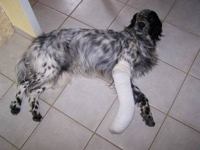 La blessure de Voltige : entorse avec arrachement osseux à l'insertion du ligament radio-carpien !! 6 semaines d'immobilisation : dur dur un setter sans courir