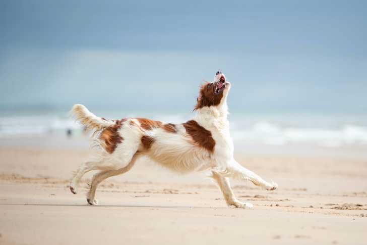 Un Setter Irlandais Rouge et Blanc en train de courir sur une plage