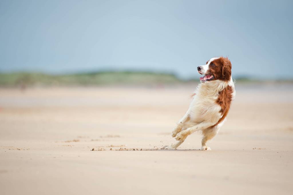 Un Setter Irlandais Rouge et Blanc en train de jouer sur une plage