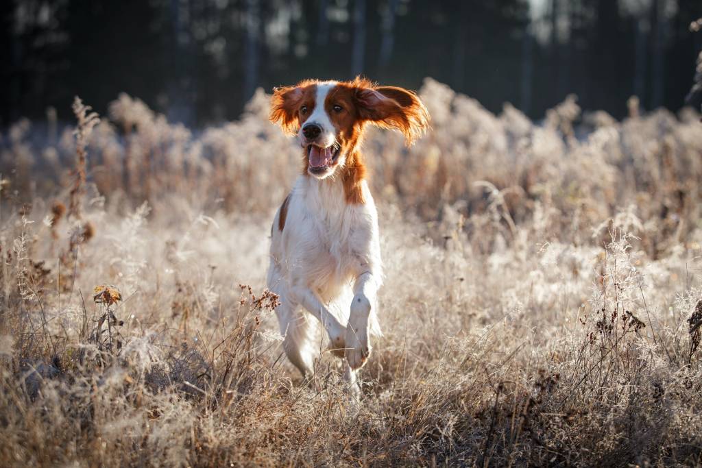 Un Setter Irlandais Rouge et Blanc en train de courir dehors